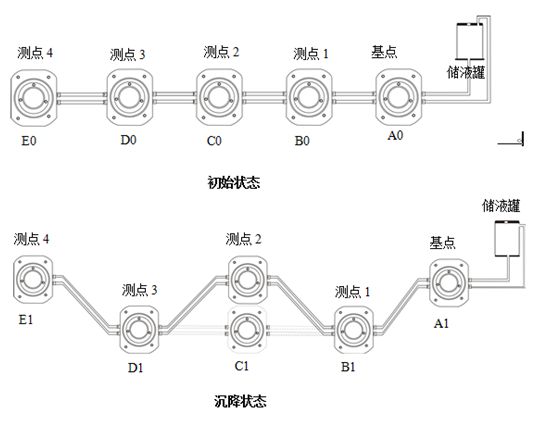 当其中任意一个传感器的高程一旦确定或者通过其它方式测定,测改点就可以做为基准点。或将储液罐视为基准点时,即可通过压力传感器的压力变化直接获取该测点的相对沉降(或抬升)。